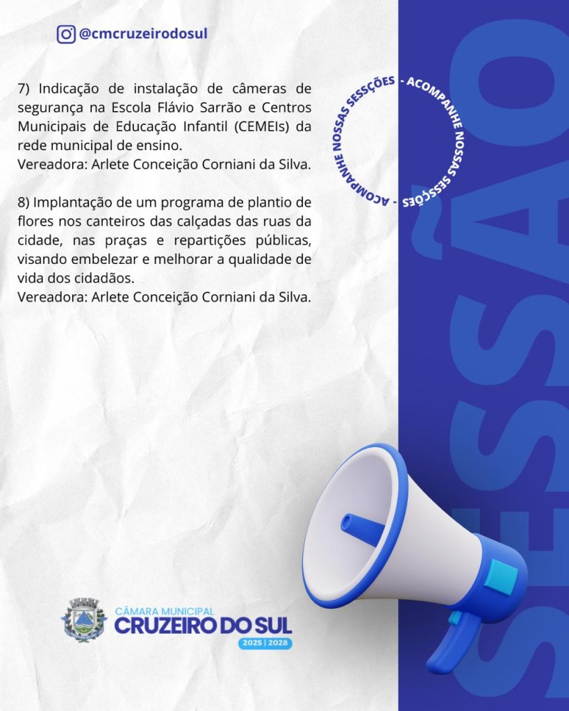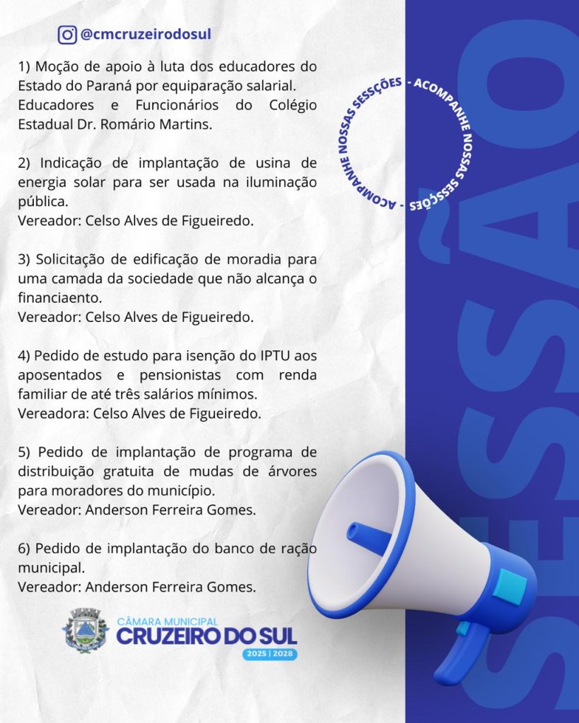 A população está convidada a acompanhar a sessão presencialmente no plenário da Câmara Municipal.